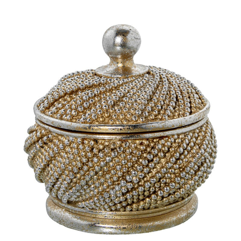 Guarde as suas jóias com sofisticação nesta caixa em resina prateada. O design refinado com detalhes texturizados, semelhante à elegância da nossa bandeja, torna esta peça ideal para complementar a decoração de qualquer quarto ou closet. Uma combinação perfeita de funcionalidade e beleza, protegendo os seus acessórios com charme único.