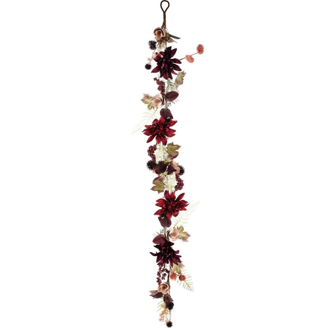 Transforme o seu ambiente com esta sofisticada guirlanda decorativa, adornada com flores e folhas em tons de borgonha e verde. Com 120 cm de comprimento, esta peça é perfeita para criar um ambiente acolhedor e festivo, ideal para ser pendurada em portas, lareiras ou como destaque numa mesa. As suas cores ricas e texturas naturais trazem um toque de elegância e frescura à decoração, seja em épocas festivas ou durante todo o ano.