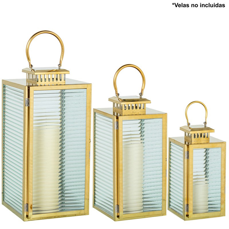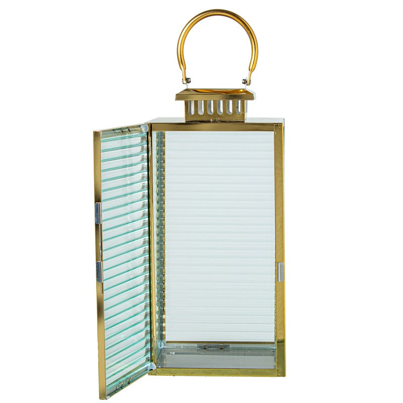 Elegante e sofisticada, esta lanterna em metal cromado dourado adiciona um toque de charme e requinte a qualquer ambiente. O design moderno, aliado ao vidro transparente, permite uma iluminação suave e acolhedora, ideal para criar atmosferas envolventes em interiores ou exteriores cobertos. Perfeita para velas decorativas, transforma qualquer espaço com um brilho encantador.