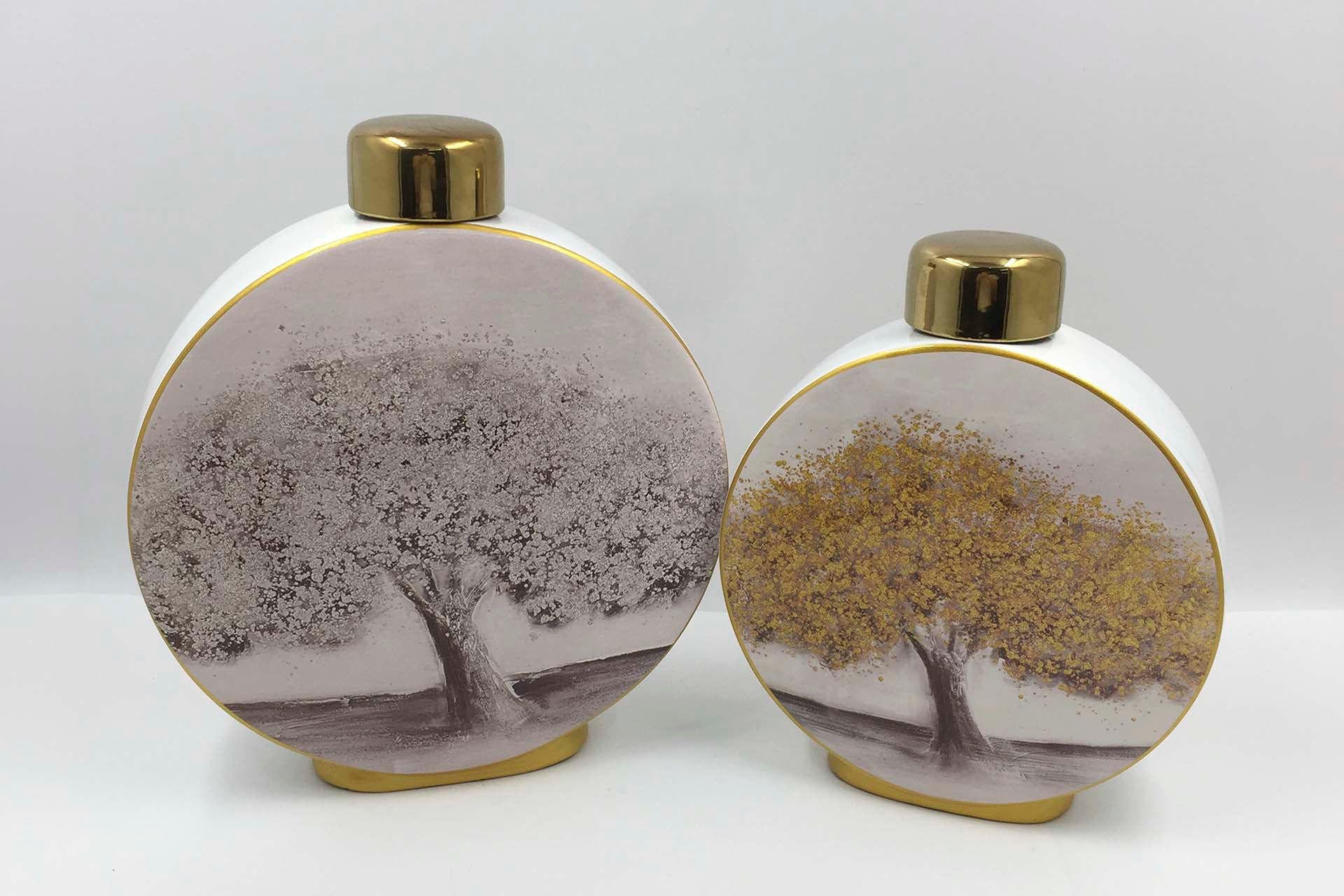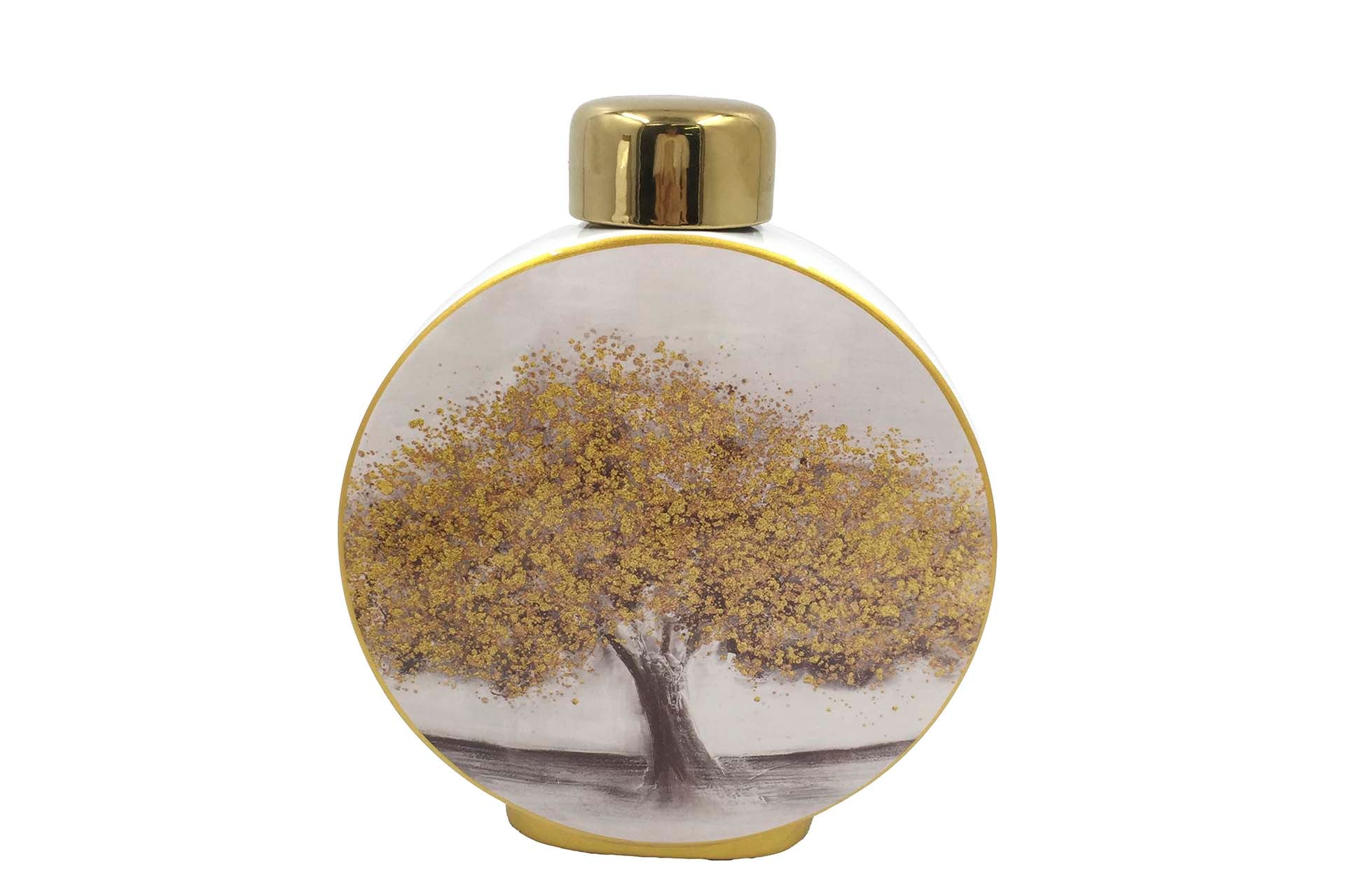 Este elegante pote redondo em cerâmica destaca-se pelo seu design refinado com o delicado detalhe de uma árvore estilizada. Os apontamentos dourados acrescentam um toque de sofisticação, tornando esta peça ideal para complementar qualquer decoração moderna ou clássica. Com um acabamento impecável e de grande durabilidade, é perfeito para decorar estantes, mesas ou consoles, conferindo ao ambiente uma sensação de requinte e harmonia.