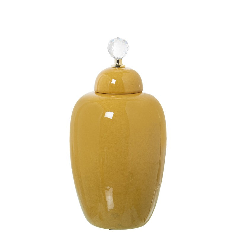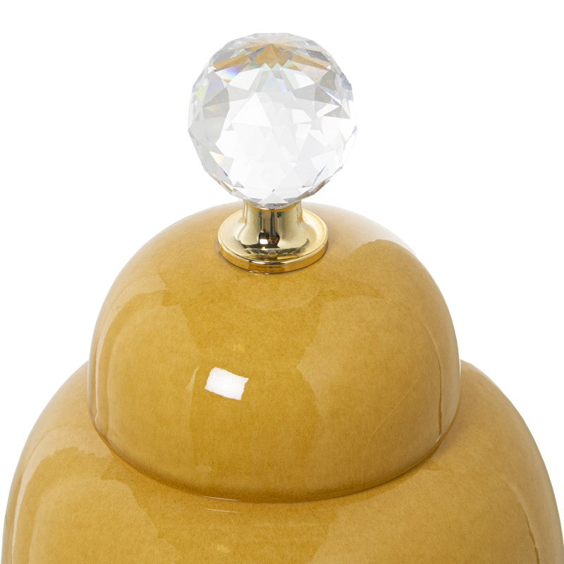 Este pote decorativo em cerâmica amarelo mostarda tampa, é uma peça de destaque que combina funcionalidade e elegância. O apontamento da tampa imita cristal, acrescentando um toque de sofisticação e brilho discreto à peça. Com um acabamento brilhante e linhas suaves, este vaso é ideal para compor ambientes requintados e modernos, seja para guardar pequenos objetos ou apenas para decorar o espaço com elegância.