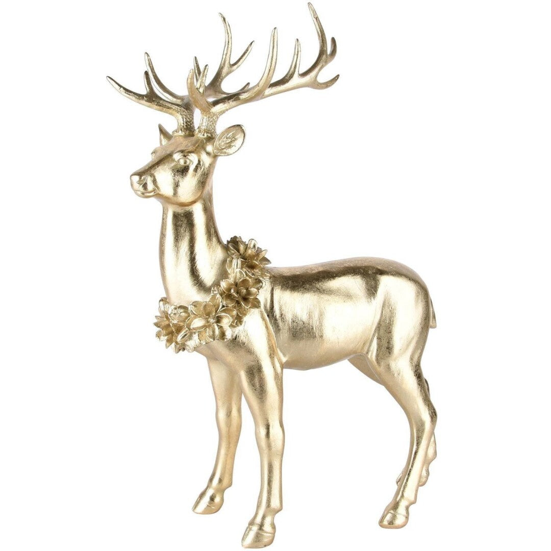 Eleve a sua decoração com esta graciosa rena em pé, adornada com um delicado colar de flores dourado. Feita em poliresina, essa peça sofisticada é ideal para criar uma atmosfera encantadora e festiva, seja no período natalino ou em composições elegantes durante o ano todo. O acabamento dourado traz um toque de brilho e luxo, tornando essa rena uma peça central perfeita para decorar mesas, prateleiras ou qualquer espaço que mereça um detalhe refinado.