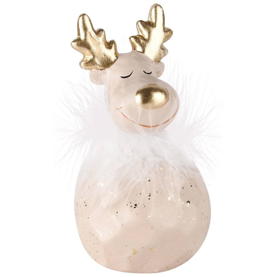 Adicione um toque encantador à sua decoração com esta adorável rena, que exibe um colar de penas em um tom bege suave. Com suas dimensões compactas, esta peça é perfeita para complementar mesas, prateleiras ou qualquer espaço que precise de um detalhe especial. Seu design delicado e sofisticado traz um charme adicional ao ambiente, ideal para a decoração natalina ou para dar um toque de estilo durante todo o ano.